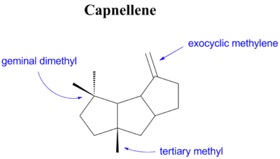 Capnellene is also a sesquiterpene, a class of terpenes that are natural semiochemicals. However, it is a non-isoprenoid sesquiterpene, meaning that unlike most sesquiterpenes its structure is not based on a repeated isoprene unit. Capnellene is the presumed biosynthetic precursor to the capnellanols, a group of alcohols based on the capnellene skeleton that are also produced by Capnella imbricata, however the biosynthesis of these compounds has not yet been elucidated.[2][3]