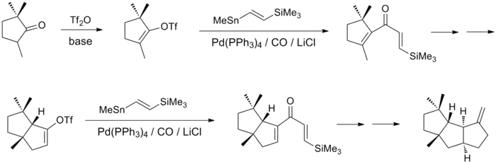 Since the first synthesis, many investigators have successfully assembled capnellene and its derivatives. Approaches to this synthesis are diverse, and include central steps such as annululation, olefin metathesis, radical cyclization, and trapping reactions.[2][3][6][13][16][17] The most heavily cited synthesis in the literature involves two key intermediates formed by a Stille reaction, the palladium-catalyzed coupling of vinyl triflate with vinyl stannane.[18] The readily prepared trimethylcyclopentanone can be converted into vinyl triflate, which is coupled with vinylstannane in the first palladium-catalyzed step to yield the desired divinyl ketone. The second 5-membered ring is formed via Nazarov cyclization, and the product is prepared for a second palladium-catalyzed coupling. This step yields another divinyl ketone, which can be cyclized to an enone, hydrated, and converted to an alkene via olefination to yield capnellene.