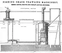 Capstan winches were also important on sailing trawlers (e.g. Brixham trawlers) as a means for fetching in the nets after the trawl. When they became available, steam powered captan winches offered a great saving in effort. These used a compact combined steam engine and boiler below decks that drove the winch from below via a shaft. Ruston, Proctor and Company at the UK 1883 Fisheries Exhibition marketed an engine, boiler, shafts and capstan designed specifically for this task.[4]