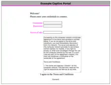 A captive portal is a web page accessed with a web browser that is displayed to newly connected users of a Wi-Fi or wired network before they are granted broader access to network resources. Captive portals are commonly used to present a landing or log-in page which may require authentication, payment, acceptance of an end-user license agreement, acceptable use policy, survey completion, or other valid credentials that both the host and user agree to adhere by. Captive portals are used for a broad range of mobile and pedestrian broadband services – including cable and commercially provided Wi-Fi and home hotspots. A captive portal can also be used to provide access to enterprise or residential wired networks, such as apartment houses, hotel rooms, and business centers.