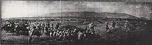 Although the 4th Cavalry Division had started later, riding north on the left and to the rear of 5th Cavalry Division in echelon, both divisions approached Liktera on the Nahr el Mefjir.[28] Faced with the "whole plain alive with cavalry twelve miles behind the Turkish line", Liktera was quickly captured, along with 50 prisoners. The remainder of the Liktera garrison retreated towards Qaqun, closely followed by the Jacob's Horse (11th Cavalry Brigade, 4th Cavalry Division), which took 126 prisoners. This regiment went forward to Tell edh Dhrur, where another 80 prisoners were captured.[27]