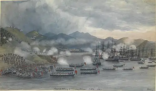 The fortified city of Dinghai, with a population of 30,000, was defended by the Chinese under the command of Keo. After a brief one-sided seaborne operation involving the 55th Foot, the city fell to the far superior British forces which captured 100 iron guns, 36 brass cannon, and 540 gingalls (heavy muskets or light guns mounted on swivels) for the loss of 2 British killed and 28 wounded.[6][7]