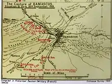 The 4th Cavalry Division's 70 miles (110 km) pursuit from Deraa to Damascus began with Prince Feisal's Arab force commanded by the Iraqi volunteer Nuri es-Said on the right flank while in the vanguard Arab irregulars (possibly Beni Sakhr) harassed the Ottoman force.[39][40] As they rode north they passed the bodies of about 2,000 Ottoman soldiers (according to Barrow) as well as their abandoned transport and equipment.[41]