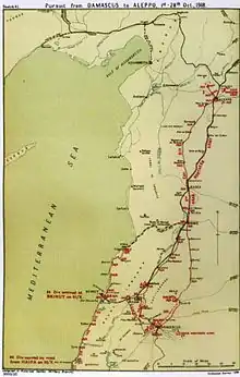 A conference at Jenin on 25 September with GHQ and Desert Mounted Corps staffs, was followed the next day by a corps commanders' meeting chaired by Allenby and orders for the pursuit were issued on 27 September.[3] Allenby outlined his planned advance to Damascus to Wilson on 25 September. The first stage to the line, "Damascus–Beirut" was to begin shortly. While an infantry division marched up the coast from Haifa to Beirut, three divisions of the Desert Mounted Corps would advance on Damascus. The fourth division which had captured Amman was to remain to capture the retreating Fourth Army units from Ma'an. Allenby planned for Chaytor's Force to rejoin the Desert Mounted Corps at Damascus.[14] The 7th (Meerut) Division did not leave Haifa until the day Damascus was captured, on 1 October. The leading troops reached Beirut on 8 October.[15][16]