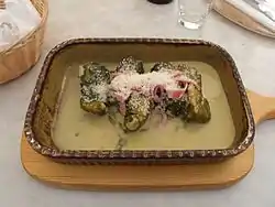 Capuns is a traditional food from the canton of Graubünden in Switzerland, predominantly made in the eastern part.[1] They are made from Spätzle dough[2] with pieces of dried meat, such as air-dried beef (Bündner Fleisch) and/or Salsiz,[3] and rolled in a chard leaf. They are boiled in a gravy of bouillon, milk and water and served covered with grated cheese.[4]