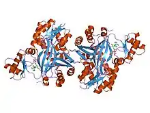 Carbamoyl phosphate synthase (CPSase) is a heterodimeric enzyme composed of a small and a large subunit (with the exception of CPSase III, which is composed of a single polypeptide that may have arisen from gene fusion of the glutaminase and synthetase domains).[2][3][6] CPSase has three active sites, one in the small subunit and two in the large subunit. The small subunit contains the glutamine binding site and catalyses the hydrolysis of glutamine to glutamate and ammonia, which is in turn used by the large chain to synthesize carbamoyl phosphate. The small subunit has a 3-layer beta/beta/alpha structure, and is thought to be mobile in most proteins that carry it. The C-terminal domain of the small subunit of CPSase has glutamine amidotransferase activity. The large subunit has two homologous carboxy phosphate domains, both of which have ATP-binding sites; however, the N-terminal carboxy phosphate domain catalyses the phosphorylation of biocarbonate, while the C-terminal domain catalyses the phosphorylation of the carbamate intermediate.[7] The carboxy phosphate domain found duplicated in the large subunit of CPSase is also present as a single copy in the biotin-dependent enzymes acetyl-CoA carboxylase (ACC), propionyl-CoA carboxylase (PCCase), pyruvate carboxylase (PC) and urea carboxylase.