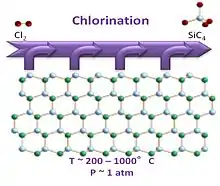 CDCs have been synthesized using several chemical and physical synthesis methods. Most commonly, dry chlorine treatment is used to selectively etch metal or metalloid atoms from the carbide precursor lattice.[1] The term "chlorine treatment" is to be preferred over chlorination as the chlorinated product, metal chloride, is the discarded byproduct and the carbon itself remains largely unreacted. This method is implemented for commercial production of CDC by Skeleton in Estonia and Carbon-Ukraine. Hydrothermal etching has also been used for synthesis of SiC-CDC which yielded a route for porous carbon films and nanodiamond synthesis.[16][17]