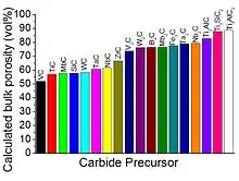 Most produced CDCs exhibit a prevalence of micropores (< 2 nm) and mesopores (between 2 and 50 nm), with specific distributions affected by carbide precursor and synthesis conditions.[18] Hierarchic porosity can be achieved by using polymer-derived ceramics with or without utilizing a templating method.[19] Templating yields an ordered array of mesopores in addition to the disordered network of micropores. It has been shown that the initial crystal structure of the carbide is the primary factor affecting the CDC porosity, especially for low-temperature chlorine treatment. In general, a larger spacing between carbon atoms in the lattice correlates with an increase in the average pore diameter.[2][20] As the synthesis temperature increases, the average pore diameter increases, while the pore size distribution becomes broader.[9] The overall shape and size of the carbide precursor, however, is largely maintained and CDC formation is usually referred to as a conformal process.[18]