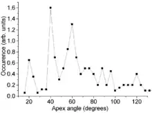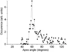 Carbon cones have also been observed, since 1968 or even earlier,[8] on the surface of naturally occurring graphite. Their bases are attached to the graphite and their height varies between less than 1 and 40 micrometers. Their walls are often curved and are less regular than those of the laboratory made nanocones. The distribution of their apex angle also shows a strong feature at 60°, but other expected peaks, at 20° and 40°, are much weaker and the distribution is somewhat broader for large angles. This difference is attributed to the different wall structure of the natural cones. Those walls are relatively irregular and contain numerous line defects (positive-wedge disclinations). This breaks down the angular requirement for a seamless cone and therefore broadens the angular distribution.[7]