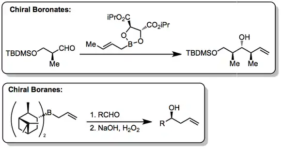 Allylic boronate and -borane reagents have also been developed for enantioselective addition to carbonyls—in this class of reactions, the allylic boron reagent confers stereochemical control[5]