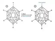 The descriptor closo indicates that the molecule is formally derived (by B-to-C+ replacement) from a borane of stoichiometry and charge [BnHn]2− (n = 12 for known carborane acids).[25] The cagelike structure formed by the 11 boron atoms and 1 carbon atom allows the electrons to be highly delocalized through the 3D cage (the special stabilization of the carborane system has been termed "σ-aromaticity"), and the high energy required to disrupt the boron cluster portion of the molecule is what gives the anion its remarkable stability.[25] Because the anion is extremely stable, it will not behave as a nucleophile toward the protonated substrate, while the acid itself is completely non-oxidizing, unlike the Lewis acidic components of many superacids like antimony pentafluoride. Hence, sensitive molecules like C60 can be protonated without decomposition.[26][27]