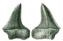 The C. escheri holotype tooth was first placed by Agassiz (1843) in the taxon Carcharodon escheri. However, on an earlier page and figure in the same publication he named a pathological tooth of the same species Carcharodon subserratus.[3]