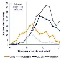 Glycogen phosphorylase isoenzyme BB (abbreviation: GPBB) is one of the three isoforms of glycogen phosphorylase. This isoform of the enzyme exists in cardiac (heart) and brain tissue. Because of the blood–brain barrier, GP-BB can be seen as being specific to heart muscle. GP-BB is one of the "new cardiac markers" which are considered to improve early diagnosis in acute coronary syndrome. During the process of ischemia, GP-BB is converted into a soluble form and is released into the blood. A rapid rise in blood levels can be seen in myocardial infarction and unstable angina. GP-BB is elevated 1–3 hours after process of ischemia. |