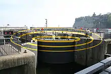 The Cardiff Bay Arts Trust (CBAT), now known as Safle, commissioned Swiss artist Felice Varini to produce a piece of public art for the CHA, entitled 3 Ellipses for 3 Locks. It cost £25,000 and was produced between 11 and 25 March 2007. Three yellow ellipses were painted onto locks and gates, with professional mountain climbers being used to access the barrage's more difficult sections. It was Varini's first work in Wales and the UK and took a year to plan.[8]