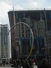 As part of the St Davids 2 development, the Hayes was pedestrianised and repaved. A new public square was created at its southern end with a large, interactive public artwork as its centrepiece called Alliance, a 25 metres (82 ft) high sculpture consisting of a large stainless steel and enamelled metal ring and an arrow column, which was initially meant to feature lights that would rise and fall with the tide.