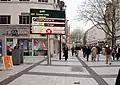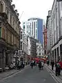 Queen Street (Welsh: Heol y Frenhines) is the main thoroughfare in the city, now wholly pedestrianised. Most of Queen Street, from the castle moat to Dumfries Place, used to be called Crockherbtown (Crockherbtown Lane can still be found off Park Place),[8] but the street was renamed in honour of Queen Victoria in 1886.[9] Queen Street was pedestrianised in 1974 and is served by Cardiff Queen Street railway station on Station Terrace. It meets Dumfries Place/Newport Road at its eastern end, Duke Street/Castle Street at its western, and Park Place approximately halfway along. Further down Park Place is the New Theatre, a local landmark is Principality House, head office of the Principality Building Society.[10] To the north running parallel is Greyfriars Road, referring to the site of an old monastery, a traditional office location that has recently seen conversion to bars, apartments and hotels as offices move to the new business parks on the edge of the city, or to the better connected southern end of the city centre.