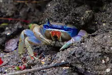 Cardisoma guanhumi, also known as the blue land crab, is a species of land crab found in tropical and subtopical estuaries and other maritime areas of land along the Atlantic coast of the Americas from Brazil[2] and Colombia, through the Caribbean and Gulf of Mexico, to the Bahamas, and north to Ponce Inlet, Florida[3] Princess Place Preserve on the Palm Coast, and Bermuda.[4] The species varies in colour from dark blue to brown or pale grey, and may grow to 15 centimetres (6 in) in carapace width and weigh over 500 grams (18 oz).[3][5]