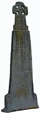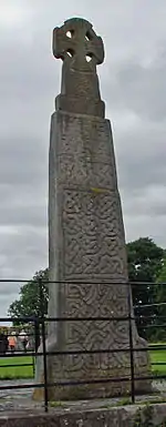 It is similar in design to the cross at Nevern.[2] It is inscribed, on the west face "MARGIT EUT REX ETG [uin] FILIUS" and otherwise decorated in abstract patterns.[5] The cross is 4 metres (13 ft) tall and is in two parts, joined by a tenon joint. The top is Carmarthenshire sandstone and the lower portion is igneous-type stone from Preseli.[2]