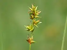 It is known in the British Isles as "spiked sedge",[1][4] in North America as "spicate sedge"[5] or "prickly sedge".[6] In Irish it is called cíb spícíneach,[7] and in Welsh, its name is hesgen dywysennog borffor,[8] hesgen dywysennog[9] or hesgen ysbigog borffor.[10]