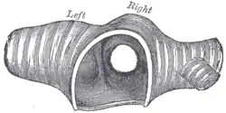 ![]() Transverse section of the trachea, just above its bifurcation, with a bird’s-eye view of the interior. (Carina not labeled; the ridge that separates the left and right bronchus.) | |