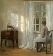Holsøe's paintings include landscapes, still lifes and flowers, but like Hammershøi he primarily painted domestic interior scenes;[1] they undoubtedly influenced each other, but it is impossible to know who first gravitated towards this subject.[2] It was in general increasingly popular among Danish painters as the country became more industrial, with implications of refuge and restoration from professional life and the city.[5] Holsøe's works have come to be overshadowed by Hammershøi's: his coloration is less subtle and although there are characteristically one or sometimes a small group of figures, Holsøe's work is less innovative and unemotional by comparison with Hammershøi's expressionism.[1][2][6] In his mastery of form and enjoyment of the beauty of things—characteristically high-ceilinged rooms with mahogany furniture—he has been compared to the Dutch masters.[1][2] His paintings have been forged (with difficulty).