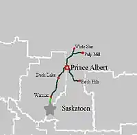 The Carlton Trail Railway (reporting mark CTRW) is a shortline railway with its headquarters in Prince Albert, Saskatchewan. It is operated by OmniTRAX, an American transportation company in Denver, Colorado. Carlton Trail has been operating on ex-Canadian National track since Dec 8, 1997;[1] however, after the acquisition of the branch line CTRW also purchased from CN the Birch Hills-Fenton-Prince Albert branch line in 2001. Since the closure of the pulp mill in 2006, Carlton Trail has typically adhered to a schedule of twice weekly rail service, hauling approximately 2000 carloads per year. According to OmniTrax president Darcy Brede, when the mill reopens in 2014, the railway will begin six days a week service, hauling approximately 3000 carloads a year.[2]