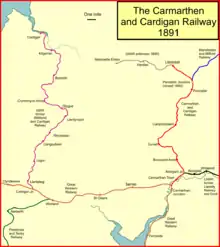 The Carmarthen and Cardigan Railway was a 7 ft 1⁄4 in (2,140 mm) broad gauge railway line in Wales that was intended to connect Carmarthen on the South Wales Railway with Cardigan. In fact, it was unable to raise the necessary capital and was loss-making from the time of opening the first short section of its line in 1860, and it was in receivership for much of its life. It eventually reached Llandysul in 1864 but was not extended further during its independent existence.