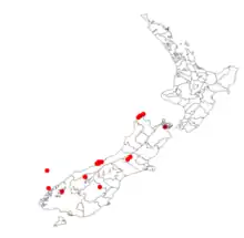 New Zealand has 23 Carmichaelia species and 14 are listed as threatened or at risk.[7] C. juncea is generally found in rocky areas where there is little competition from other plants; along open river flats, on sandy or stony lake shores and also on exposed rocky outcrops along the coast. Surviving in these tough conditions makes it an excellent plant for rock gardens or for growing in containers. C. juncea was once widespread over both the North and South Island but was probably never very common because of its specific habitat requirements. It is now considered extinct in the North Island while in the South Island it is only found in two areas; Puponga in North-West Nelson and in a few locations in South Westland from Franz Josef to Haast.[6] Like many New Zealand natives the survival of C. juncea is threatened by introduced mammals. At Franz Josef heavy browsing by hares has almost completely prevented seed production in mature plants.[7] It is also under threat from habitat loss; in particular the modification of braided rivers and because of its prostrate habit, introduced weeds.