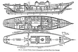 Carnegie was 155.5 feet (47.4 m) long with a beam of 33 feet (10 m). She was rigged as a brigantine, with square sails on the foremast, giving a total sail area of 12,900 square feet (1,200 m2).[1] The most distinctive feature was the observation deck, with its two observing domes made of glass in bronze frames. This allowed observations to be made under all weather conditions.[3]