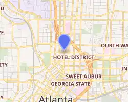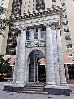The Carnegie Education Pavilion, more often known as the Carnegie Monument, is a marble Beaux-Arts monument located in Atlanta, Georgia, United States. The pavilion was constructed in 1996 from the exterior facade of the Carnegie Library, named after Andrew Carnegie. The monument pays homage to the legacy of Carnegie by serving as a monument to higher education in Atlanta, with the seals of nine local area colleges and universities embedded in the floor of the monument.[1] The monument was commissioned in 1996 by the Corporation for Olympic Development in Atlanta and designed by Henri Jova. The pavilion is located in Downtown's Hardy Ivy Park, at the curve in Peachtree Street where it diverges with West Peachtree Street.[2] The monument's inscription reads: "The Advancement of Learning." It also features the inscriptions of the names of three famous Western poets "Dante", "Milton", and "Asop", in addition to the library's namesake, "Carnegie".[3]
