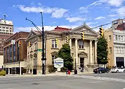 Carnegie Public Library, also known as Cabell County Public Library, is a historic library building located at Huntington, Cabell County, West Virginia. It was built in 1902–1903, in the Beaux-Arts style. It is two stories with a raised basement and has smooth gray ashlar walls. It features a pedimented, central front pavilion with paired Ionic order columns on its portico. The interior was renovated in the 1930s. It is one of 3,000 such libraries constructed between 1885 and 1919. Andrew Carnegie provided $35,000 toward the construction of the Huntington library.[2] It served the community as a library until 1980, when a new library opened across the street. The building houses Huntington Junior College.