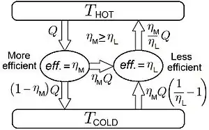 We begin by verifying the values of work and heat depicted in the right figure. First, we must point out an important caveat: the engine with less efficiency is driven as a heat pump by the engine with more efficiency , and therefore must be a reversible engine. If the engine is not reversible, then the device could be built, but the expressions for work and heat flow shown in the figure would not be valid.