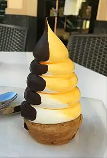 The Carolina is a typical pastry of Bilbao, Spain. It consists of a miniature pastry crust filled with custard and topped with a meringue cone. Typically the cone has a coating of sweet egg yolk glaze and dark chocolate.