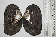 This freshwater mussel has a shell which is greenish-brown to dark brown on the outside. The inside of the shell usually has nacre that is pearly white or bluish-white, although the nacre can be pale orange in older specimens. The younger individuals tend to have faint black or greenish-brown rays on the outer surface of the shell.