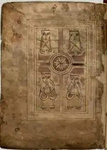 The design of the Carolingian cross borrows heavily from the compositional style of insular art contained within the interlacing or knot work of the Anglo-Saxon Lindisfarne Gospels ‘carpet pages’.[23] Sacred number theory was one of the most important features of Christian art throughout the Middle Ages, and one of the prime arguments against images and sculptures of the cross being seen as blasphemous idolatry.[24] Augustine of Hippo created one of the first defences of Christian imagery by asserting that the universe operated according to ordered design, that numerical geometric representations constituted the core of divine providence.[25] This was later backed up by Irish monks in their writings contained within the 628a.d. ‘Liber de ordine creaturarum’ (the book of the order of creation), and the dialogues contained within it, the computus (calculation).[26] The Irish monks used the logic of Boethius’ ideas on universal geometry noting that: “everything that is fashioned from the first nature of things (a prima rerum natura), is perceived to be given form by the ratio of numbers”, for this was the principal exemplar in the creator's mind.[27] From this is derived the multiplicity of the four elements, the changes of the seasons, and the understanding of the cycle of the motion of the stars and the heavens.[28] This idea of the four elements ties in well with the Carolingian cross imagery: the four elements = the four cross points; which in turn comes to symbolically represent the four ideas of divine providence; the father (God), the son (Christ), the holy spirit, and the divine order or unity of the cosmos, as is seen in the Essen Gospels.[29] Gospel manuscripts were a vital component to the Christianisation of Frankish medieval Europe, as most non-Christian societies of the time had sparse written records of their religious beliefs and were generally illiterate in Latin.[30] The visual imagery and spoken poetry of gospels aided in the spread of the cross being understood by all lay people and non-Christians alike as the ultimate representation of Christ.[31]