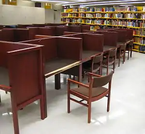 Carrel desks are especially common in academic libraries.[2] Sometimes the seat is integrated with the carrel desk. They may also have a shelf, built-in illumination, electrical outlets, or Ethernet ports.[1] Unlike the cubicle desk, carrel desks usually have no file drawers or other facilities. They are designed to stand alone or to be grouped together, with or without common sides or walls.