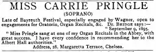 Pringle was the only one of the original Flowermaidens not to be re-engaged for the 1883 production of Parsifal, and moved with her parents and siblings to London. In England her career was fitful and she apparently never appeared on the opera stage again. Other members of the family also sought musical professions, including her brother Godfrey Pringle (1867–1900) who wrote two operas. Pringle and her mother both gave music lessons, and she herself sought by advertisement engagements for theatres and seaside piers during the holiday seasons.[5] Pringle never married; she died in Brighton in 1930 of ovarian cancer.[6]