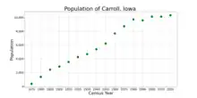 Carroll is a city in, and the county seat of, Carroll County, Iowa, United States,[3] along the Middle Raccoon River. The population was 10,321 in the 2020 census.[4]
