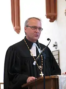 In 2015, the synod of his church elected him a bishop in the sixth ballot. A lot of members were against his conservative opinions. He rejected gay marriage and was against gay pastors who live together.[2][3] Protesters in his own church criticized him for his tolerance of the far-right Alternative for Germany (AfD).[4][5]
