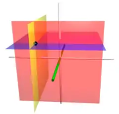 The coordinate surfaces of the Cartesian coordinates (x, y, z). The z-axis is vertical and the x-axis is highlighted in green. Thus, the red hyperplane shows the points with x = 1, the blue hyperplane shows the points with z = 1, and the yellow hyperplane shows the points with y = −1. The three surfaces intersect at the point P (shown as a black sphere) with the Cartesian coordinates (1, −1, 1).
