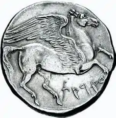 In Sicily the Carthaginians minted Jenkins-Lewis, Group VIII electrum and Series VI silver. Group VIII consisted of a single denomination of 21.6 g - a triple shekel - with a gold content of 30 %.[48][45] The Series VI silver probably is divided into three denominations: a six-shekel or dodecadrachm coin (45 g), with a female head on the obverse and a prancing horse on the reverse; a three-shekel or hexadrachm coin (21 g), with a similar female head on the obverse and a horse's head on the reverse; and a five-shekel or decadrachm coin (36 g), with a female head on the obverse and a Pegasus flying right on the reverse.[49] Group VIII and the five-shekel coins of Series VI both bear a legend on the reverse which reads, B'RṢT (𐤁𐤀𐤓𐤑𐤕). Older scholarship interpreted this as the Punic language form of Byrsa, the citadel of Carthage, but Anna Maria Bisi argued that the more natural interpretation was "in the land." Carthaginian inscriptions show that 'RṢT ("land") was the standard term for the Carthaginian administrative districts (known in Latin sources as pagi). Jenkins argues that it indicated the "land" of Sicily.[50][51] The localisation of these issues to Sicily is based on the fact that they are only found in hoards from Sicily and the fact that their dies are not aligned.[48][52][53]