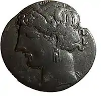 The identity of the female head appearing on the obverse of the gold and silver issues is uncertain. The head is a close imitation of obverse dies from the mint of Syracuse depicting the goddesses Kore and Arethusa. Some scholars have argued that this was simply an imitation of a trusted design and no specific identity was intended for the figure. Other scholars have argued that it should be interpreted as a depiction of the goddess Kore. In support of this is the fact that Demeter and Kore were worshipped in Carthage, where they had had a temple since 396 BC. Furthermore, the one significant change made to the image is the addition of a wreath made out of sheafs of wheat, which might have been intended to make clear that the image depicted Kore, as goddess of grain and the harvest.[24] Donald Harden argued that the head should be interpreted as the Carthaginian goddess Tanit, "in the guise of the Sicilian Persephone [i.e. Kore]," a position which is supported by many other scholars[25][26] Kenneth Jenkins suggests that this could be linked with the interpretation of the horse on the reverse as a symbol of Baal Hammon, since one of Tanit's main epithets in Carthage was Pene Ba'al (face of Ba'al), but he concedes that evidence that the Carthaginians identified Tanit with Kore is "lacking."[27]