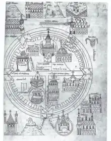 | 1100s[28] | Paris map | unknown | A round map with detailed pictures of buildings.[25] It is one of four crusader maps with a connection to the Gesta Francorum,[29] from a copy of the Liber Floridus held in the Bibliothèque nationale de France it carries part of the text from the Gesta Francorum around and within the map.[29] Thought to be from the 12th century.[28] | ![]() |