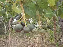 The pequi tree grows up to 10 m (30 ft) tall. It is common in the central Brazilian cerrado habitat[1] from southern Pará to Paraná and northern Paraguay. Its leaves are large, tough, hairy and palmate, with three leaflets each. Unlike most other cerrado trees, it bears flowers in the dry winter months, approximately July to September.[1]
