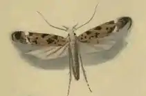 The wingspan is 10–13 mm.The head is reddish-fuscous,whitish-mixed. Terminal joint of palpi as long as second.Forewings are reddish-brown, somewhat whitish-sprinkled, edges blackish -mixed ; black basal and subbasal spots in middle stigmata black, two anterior confluent with a dark black-mixed oblique bar from costa, second discal connected with a blackish tornal spot ; a white tornal spot following this, and another on costa slightly beyond it. Hindwings 1, grey.The larva dull greenish-brown, segmental incisions paler ; dots black ; head and plate of 2 black. [3]