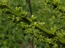 It is a dioecious plant, with male and female specimens. Its male inflorescence is a terminal raceme with small greenish flowers between 2.5–3.5 millimetres (0.098–0.138 in) in diameter. Neither male nor female flowers display any petals. Its female inflorescence is a terminal ear, also with greenish flowers ranging between 2.5–3.5 millimetres (0.098–0.138 in) in diameter, containing large and persistent bracts.[2]
