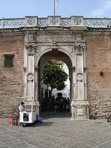 The palace is accessed through a Renaissance-style marble gate, designed by the Genoese Antonio Maria Aprile in 1529, and surmounted by a Gothic crest, possibly brought from the palace that developers were building in Bornos. The gate leads to a typical Andalusian courtyard with a fountain, and surrounded by twenty-four busts of Spanish kings, Roman emperors and other relevant characters collected from the ruins of the Roman colony of Italica distributed along the lower galleries of the courtyard. The courtyard, in turn, leads to two gardens with plateresque adornments.