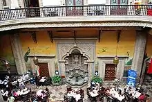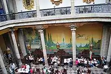 Early in the 20th century, Frank Sanborn and his brother Walter opened a small soda fountain/drugstore on Filomeno Mata Street in the historic center of Mexico City, calling it Sanborns American Pharmacy[2] In 1917, the two brothers saw the old mansion as a place to expand their business. They took two years to remodel it, putting a stained-glass roof over the main courtyard, putting in new floors and adding a peacock mural by Romanian painter Pacologue. A less important mural was painted by José Clemente Orozco in 1925 called Omnisciencia, solicited by his friend Francisco-Sergio (Paco) de Yturbe with the approval of the Sanborns brothers.[1] A restaurant covered the inner courtyard and now dominates the establishment, which now is the flagship site for a chain of restaurants called Sanborns.[6][7] The building was declared a national monument in 1931.[7] Since the early 20th century, this Sanborns has been a popular place to have a meal in luxurious surroundings.[6] The business has hosted painters, writers, actors, poets and revolutionaries. It was a symbol of a cosmopolitan atmosphere in the first half of the 20th century.[2] The building was restored again between 1993 and 1995 after suffering a minor fire on the second floor. This project was aimed at preserving the elements of the building dating from the Baroque period, the French and Art Nouveau elements of the late 19th and early 20th centuries, as well as the two murals, which had deteriorated considerably.[1] Sanborns currently belongs to billionaire Carlos Slim.