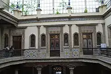 The most notable feature of the exterior are the blue and white tiles from Puebla that cover the building on three sides. Its windows, balconies and doors are framed in carved stone and French porcelain crowns on the Callejón de la Condesa and Madero Street facades.[1][5] Inside, the main courtyard contains a fountain crowned with mosaics. The fountain is surrounded by highly decorated columns and topped with more French porcelain crowns as well as a stained glass roof that was added in the 20th century. Both the fountain and columns show some damage. On the second floor, the courtyard railings are made of copper; some made in China and some made in Mexico. The overall look to the courtyard is generally Baroque but also somewhat Oriental or Mudéjar.[1]