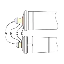 A cannon's cascabel comprises the knob (A) and the neck (B), with some models also having a filet (C). By some definitions the cascabel additionally includes the base of the breech (D). Cascabels varied in design and appearance, and were a common feature of cannons from the 17th century until the advent of the breech loading cannon in the late 19th century. Many naval guns had a heavy metal loop on the cascabel, the pomellion, through which a wide rope was passed.[1]